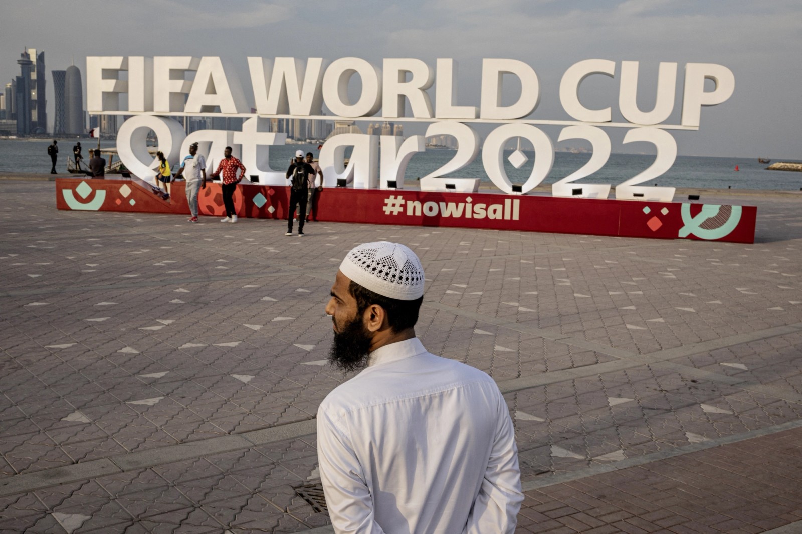 A man is pictured in front of a FIFA World Cup Qatar 2022 sign in Doha, November 17, 2022.