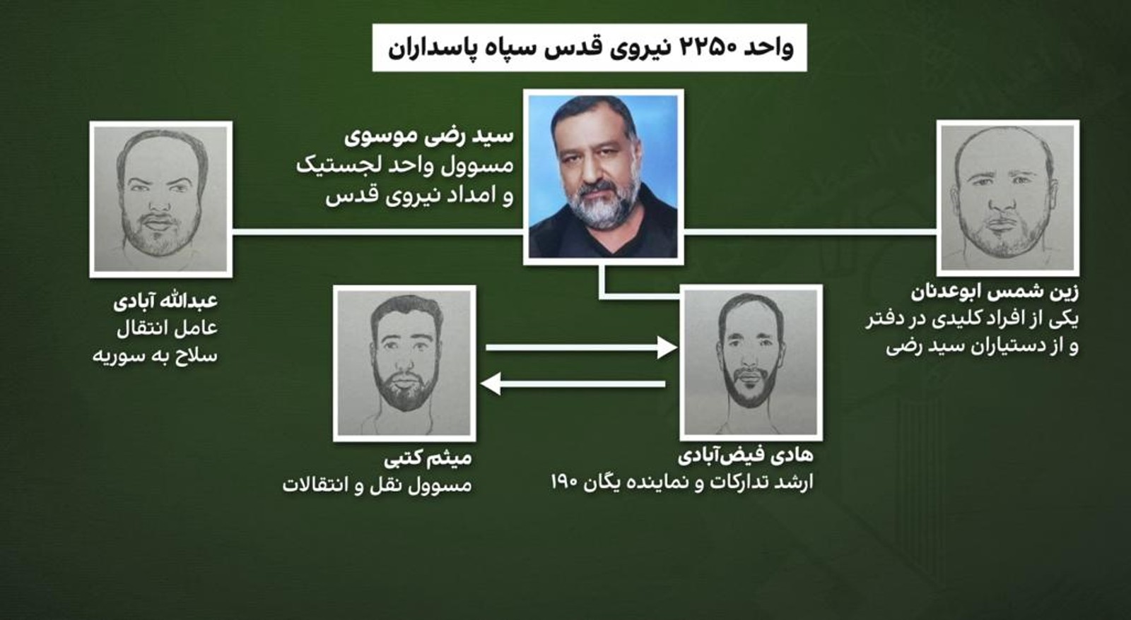 A chart showing IRGC officer Razi Mousavi with facial composites of some of his close aides