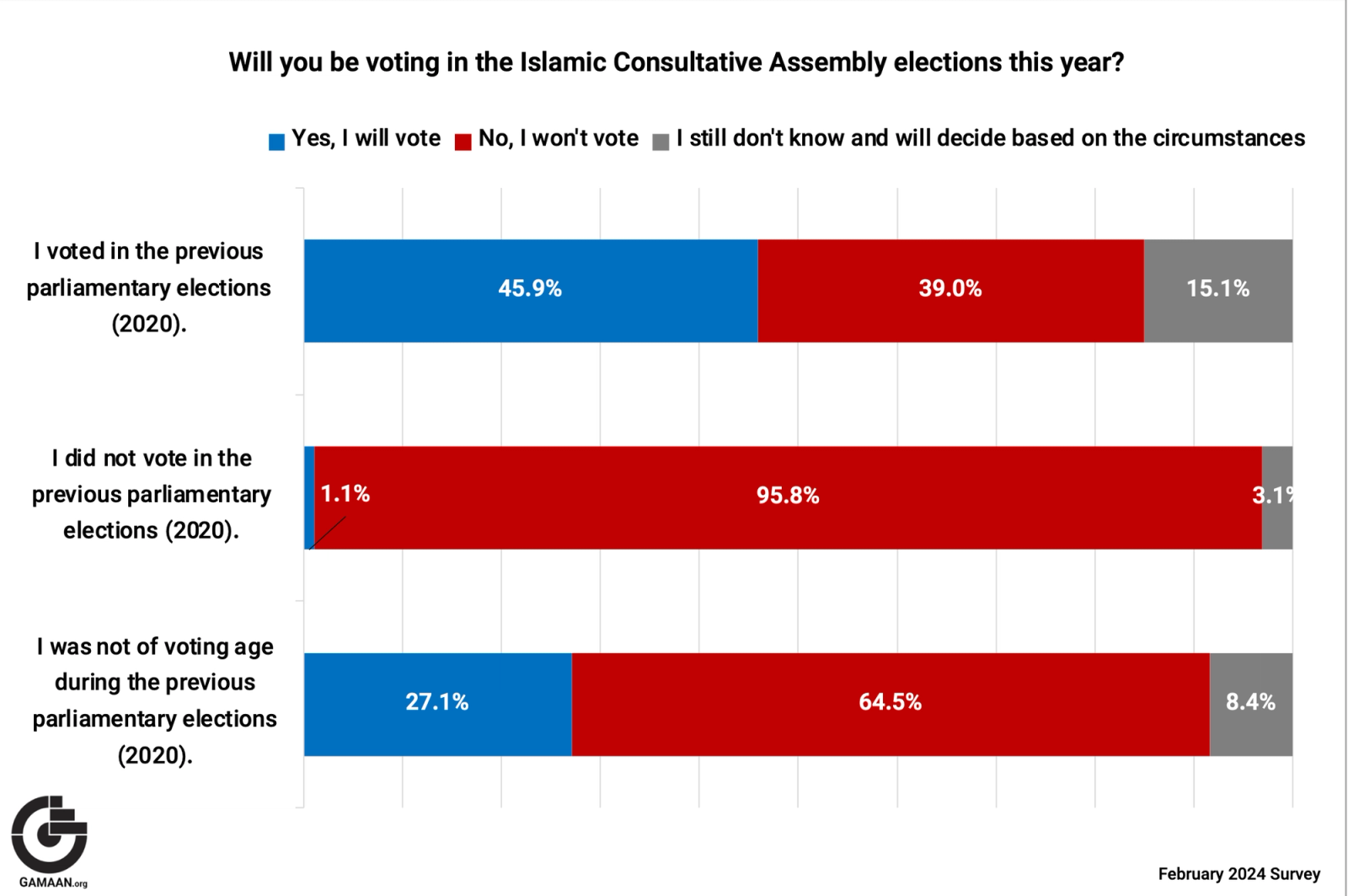 A survey by the Netherlands-based Gamaan institute collected information from 58,015 Iranian residents over an eight-day period from January 31 to February 7. Titled “Iranians’ Attitudes Toward the 2024 Elections,” the survey targeted people aged 19 and above, a sample from 90% of the country's literate adult population.
