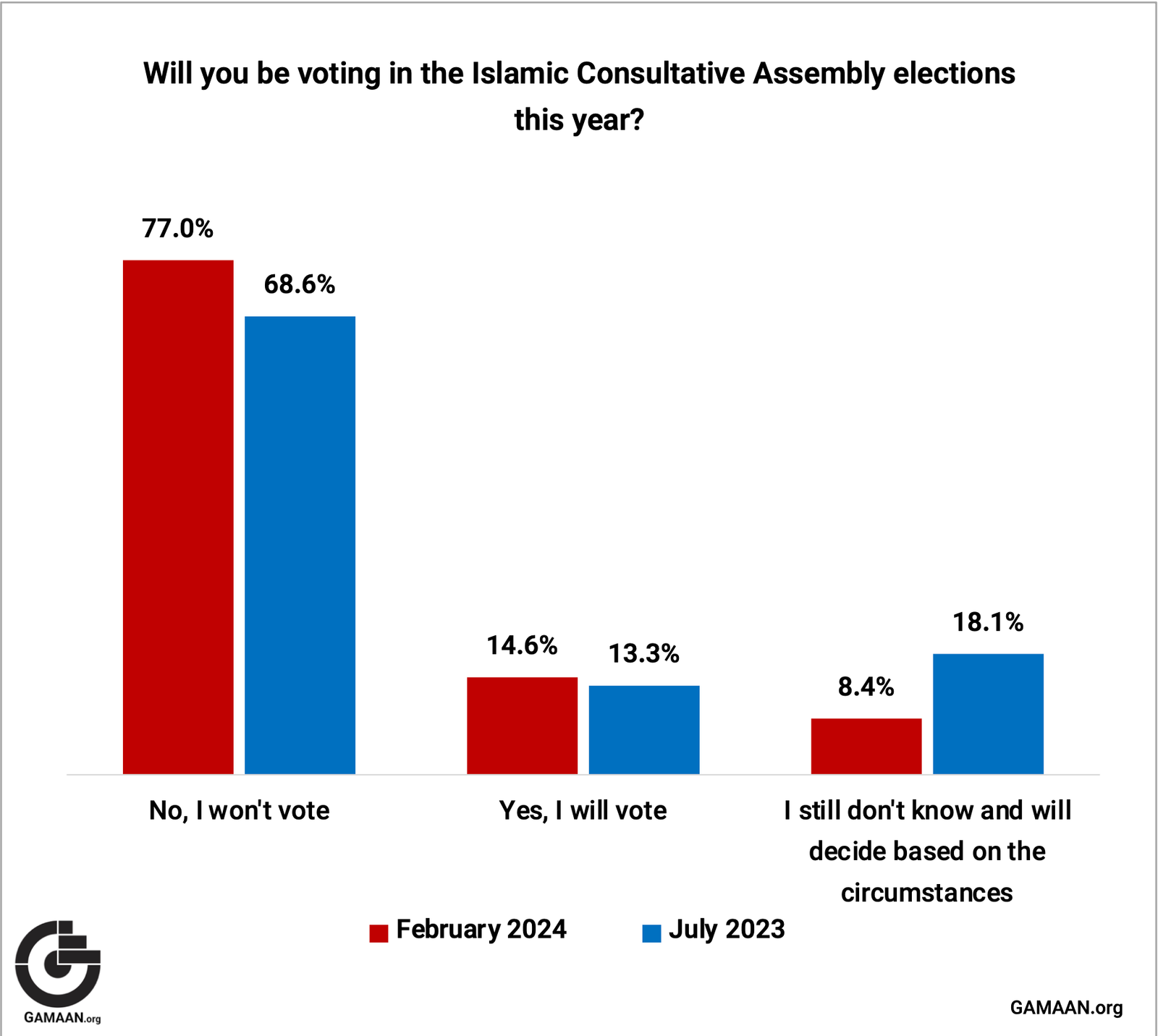 While a staggering 77 percent of respondents expressed their intention not to participate in the upcoming elections, eight percent of respondents remain undecided, while only around 15 percent expressed a definite intention to vote on March 1.