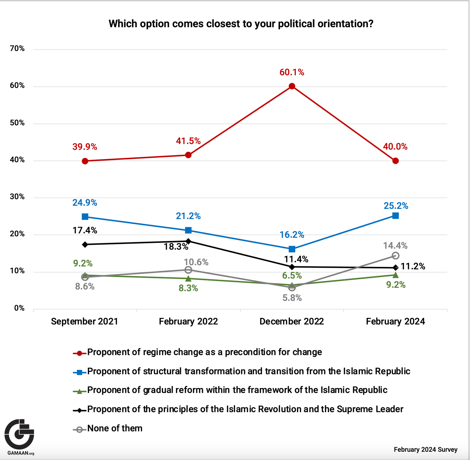 Replying to a question about their political orientation, 40 percent of the participants favored overthrowing the Islamic Republic as a precondition for any change and 25 percent voted for structural transformations and a transition from the Islamic Republic, while 11 percent supported preserving the principles and values of the Islamic Republic regime. Nine percent of the respondents expressed support for gradual reforms within the framework of the Islamic Republic system and 14 percent did not identify with any of these options.