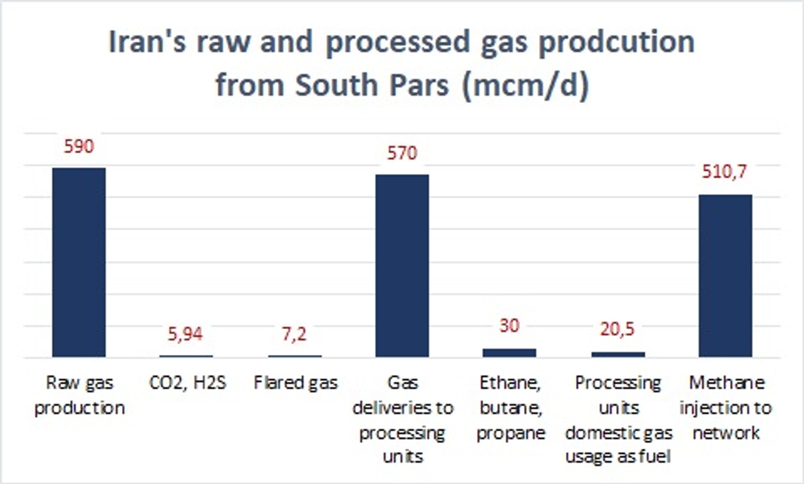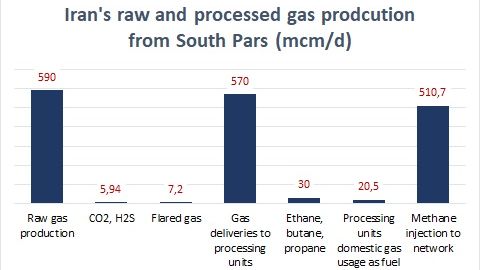 Additionally, alongside 30 mcm/d of ethane, butane, propane, and other gases, approximately 6 mcm/d of the extracted raw gas comprised toxic gases like CO2 and H2S. Moreover, more than 7 mcm/d of the output is flared and wasted during the extraction and gas purification process, while 20.5 mcm/d is consumed directly in gas processing units as fuel.