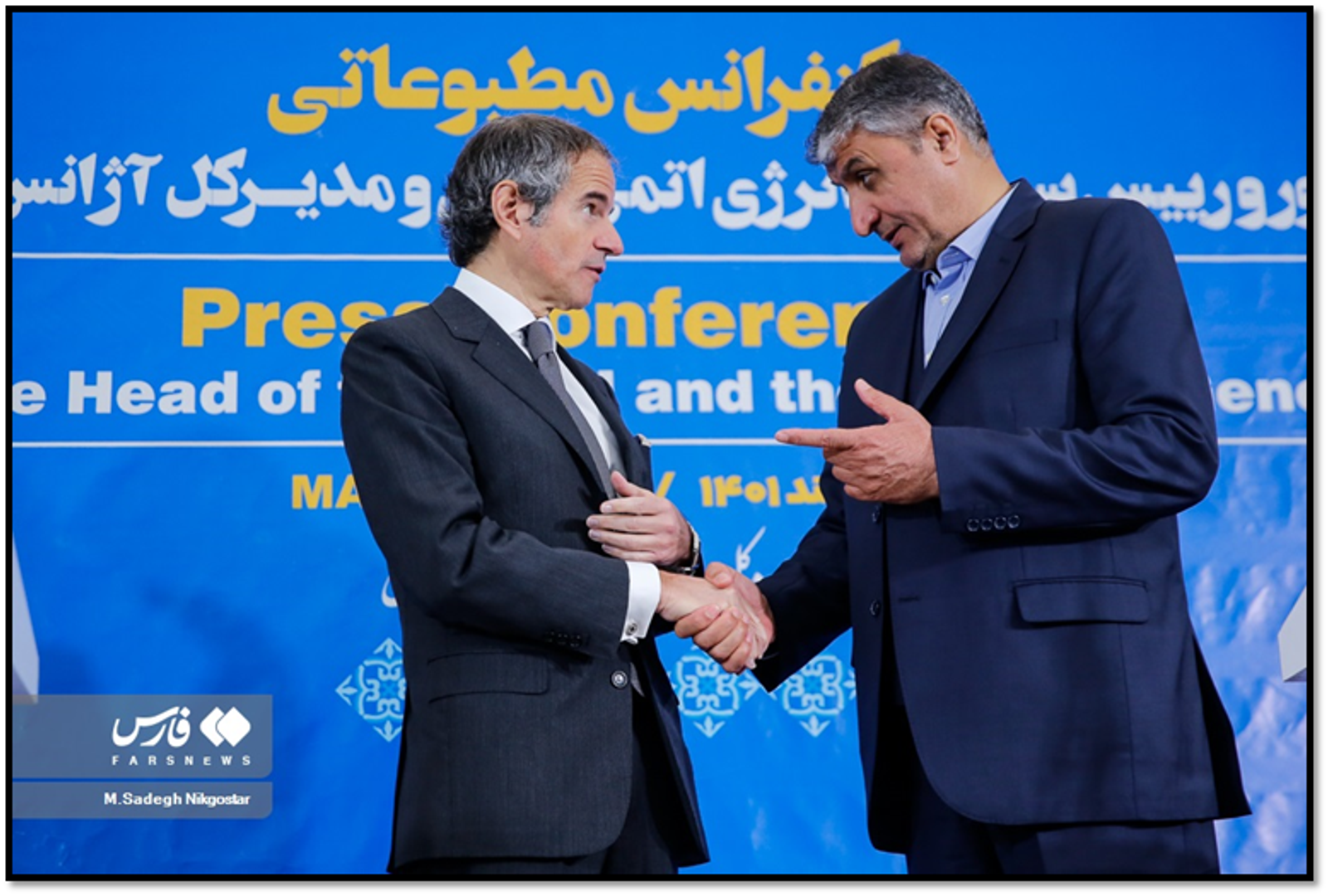 International Atomic Energy Agency Director General Rafael Mariano Grossi (left) and Mohammad Eslami, the head of the Atomic Energy Organization of Iran, during a press conference in Tehran in March 2023
