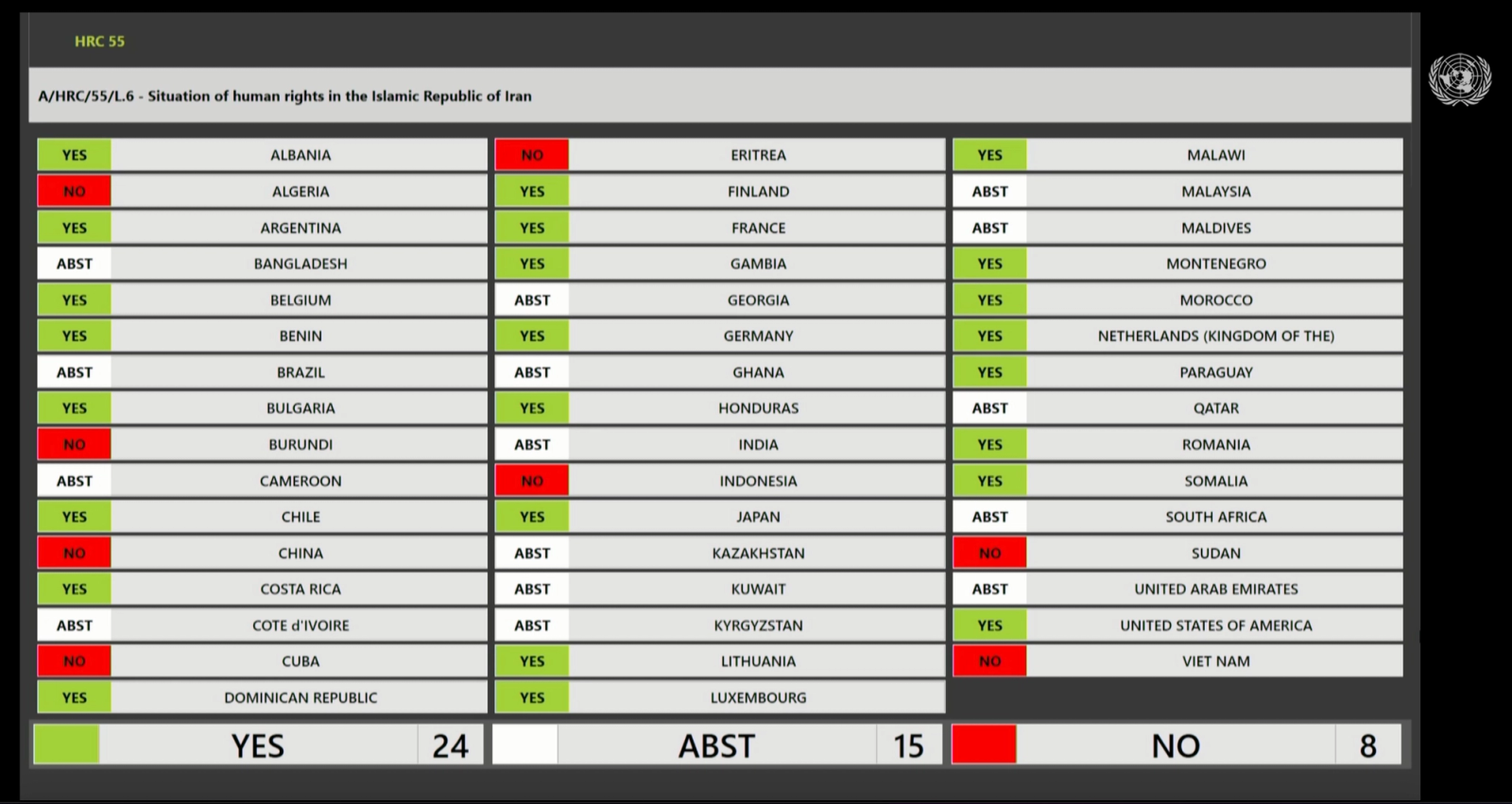 Table shows how members of the United Nations Human Rights Council (UNHRC) voted to renew the mandates of the Fact Finding Mission and the Special Rapporteur on Iran. (April 4, 2024)