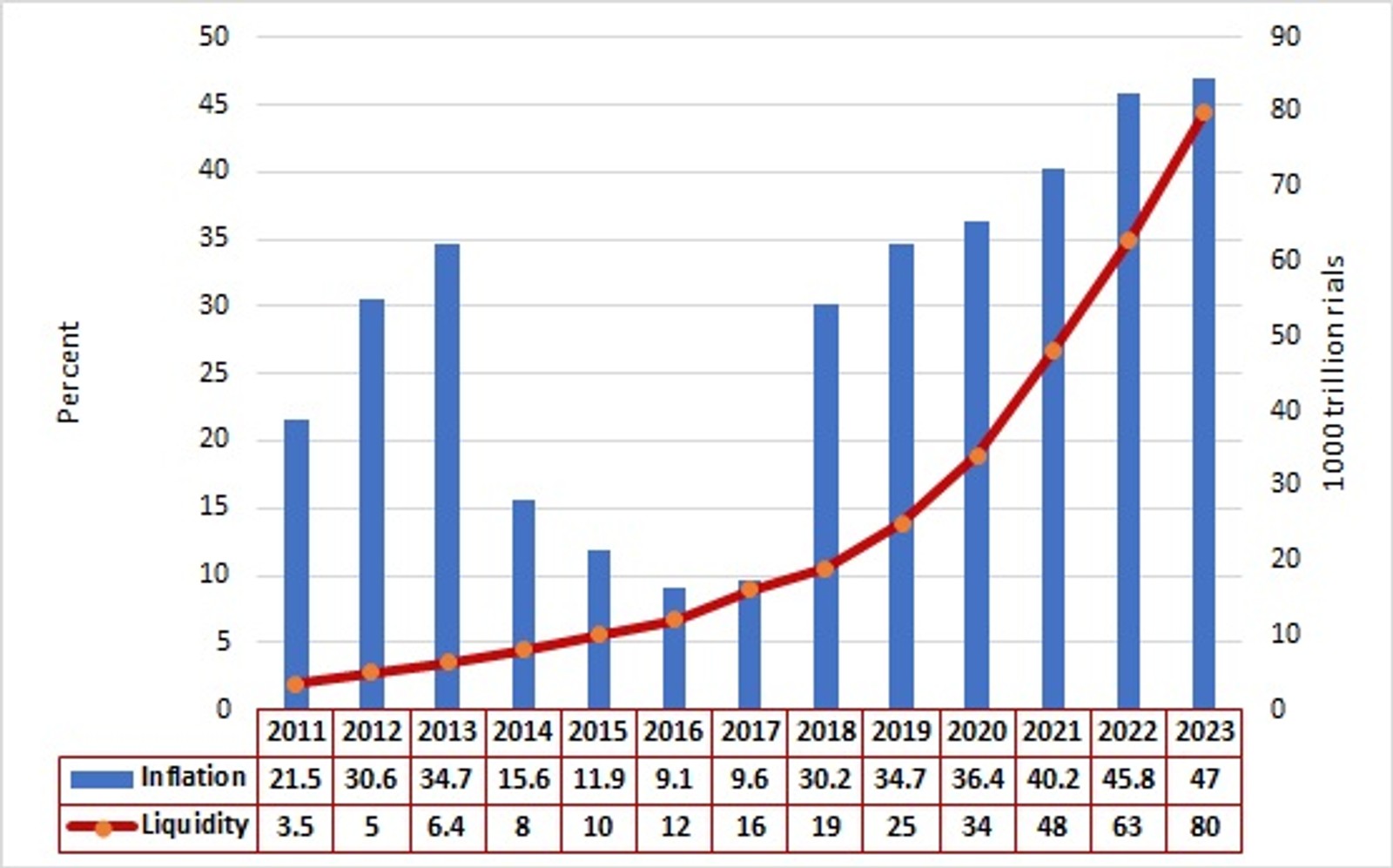 Broad money, the total money supply within an economy, is the primary cause of rampant inflation in Iran. The inflation rate, as calculated by the Central Bank of Iran (CBI), is reported at 52.3% although the International Monetary Fund (IMF), citing estimates from the Statistics Center of Iran, puts the figure slightly lower at 47%.