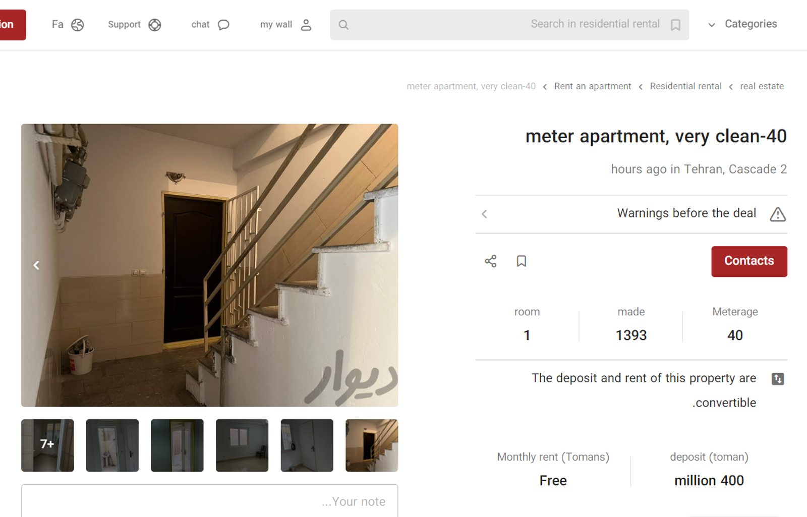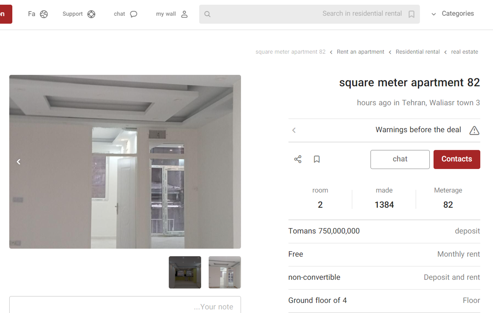 Divar, a classified ads and e-commerce mobile app, is widely used in Iran to check real estate prices. Founded in 2012, Divar serves as an online platform for real estate, vehicles, goods, community services, industrial equipment, and jobs. Our research converted deposit amounts and monthly rents to US dollars for better reader understanding, using the day's exchange rate of 580,000 rials per dollar.