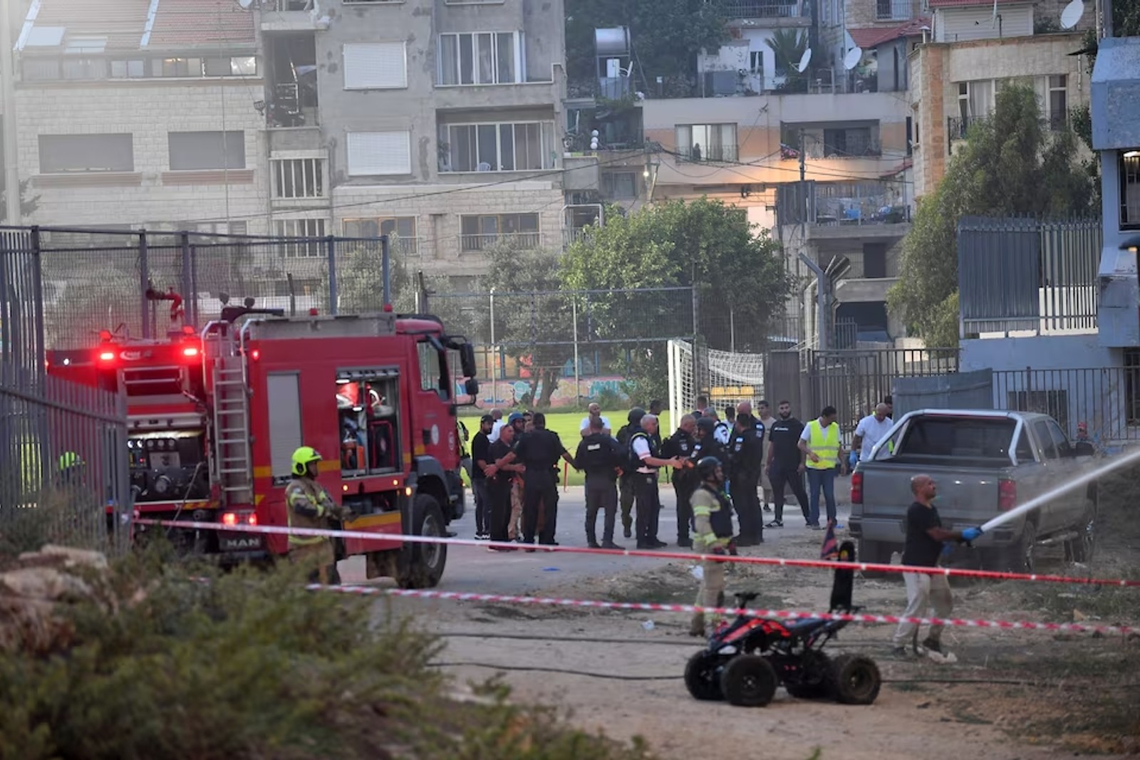 Israeli officials respond after rockets were launched across Lebanon’s border with Israel which, according to Israel’s ambulance services critically injured multiple people at a soccer pitch in Majdal Shams, a Druze village in the Israeli-occupied Golan Heights, July 27 2024.