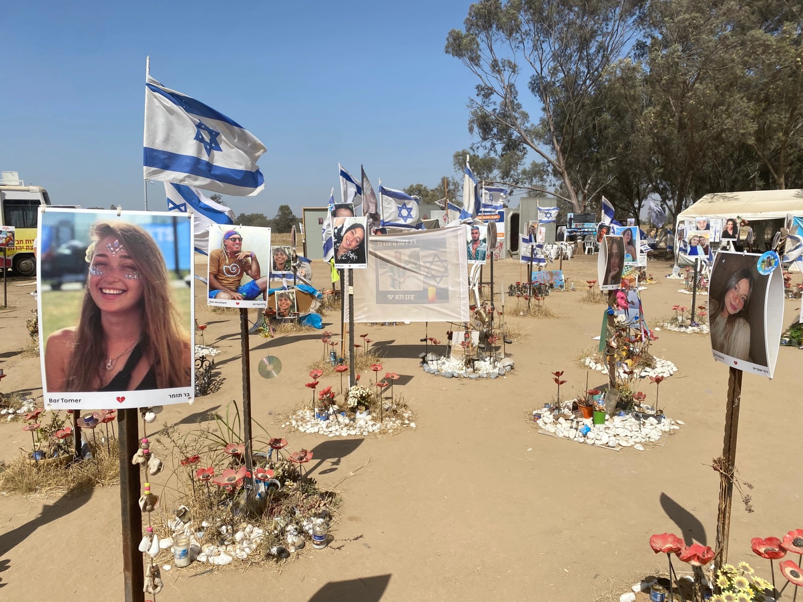 Photos of people killed and taken hostage by Hamas militants, displayed at the site near Kibbutz Re'im