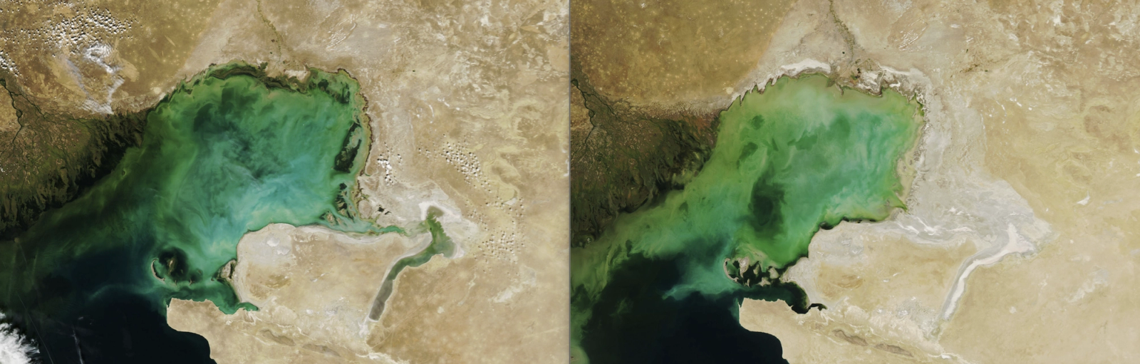 Comparative images from 2006 (L) and 2022 (R) show dramatically dropping water levels at the lake’s shallow northern side, revealing newly exposed dry land. (Source: NASA Earth Observatory)
