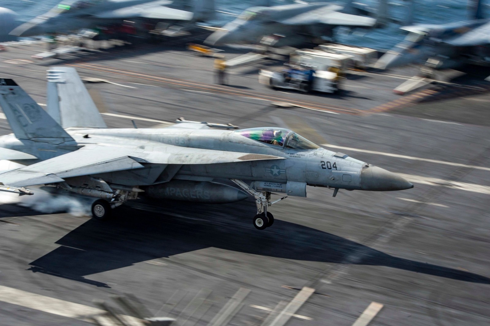 A US Navy warplane on the deck of aircraft carrier Eisenhower in the Red Sea in December 2023