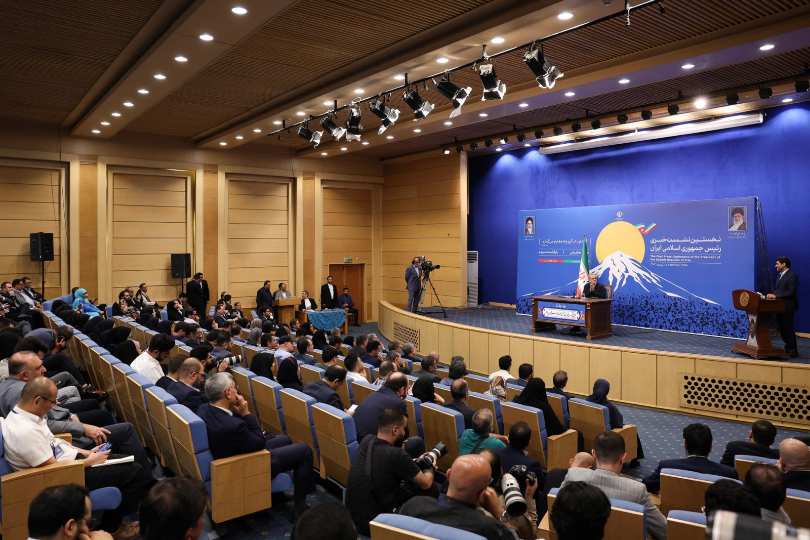 The president sat at a desk in front of a large background banner with the image of the iconic, snow-clad Mount Damavand and the sun rising from behind it in its center and the images of the current Supreme Leader and the founder of the Islamic Republic, Ayatollah Ruhollah Khomeini on either side at the top.