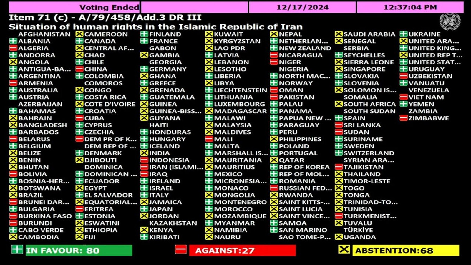 The resolution, which passed with 80 votes in favor and 27 against, criticized the Iranian government’s unlawful use of the death penalty, arbitrary arrests, torture and its persistent suppression of peaceful protests.