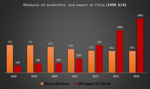 Since US oil export sanctions were imposed on Iran in 2018 and 2019, Malaysia’s oil production has actually declined by 20%. Yet, its crude oil exports to China have increased eightfold over the same period.