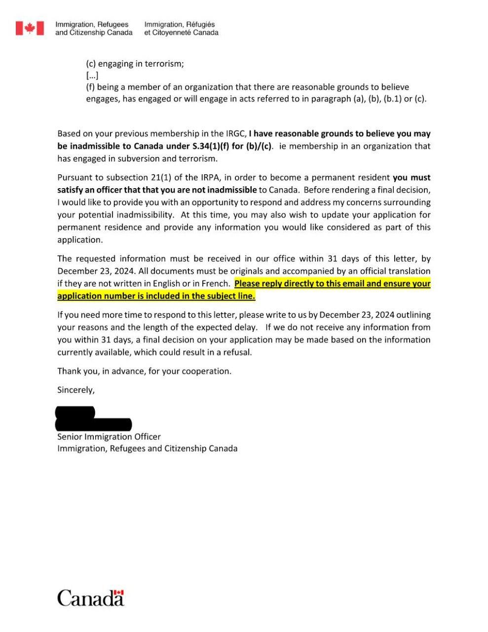 But he received and official letter saying immigration officers had “concerns surround your membership to the IRGC.”