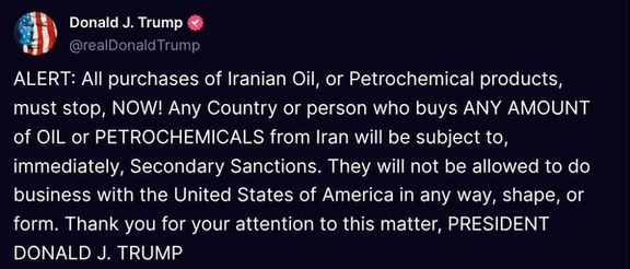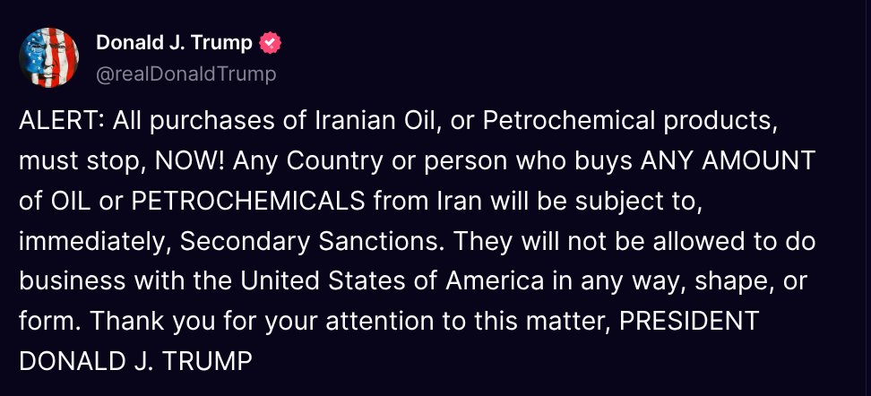 "Any Country or person who buys ANY AMOUNT of OIL or PETROCHEMICALS from Iran will be subject to, immediately, Secondary Sanctions. They will not be allowed to do business with the United States of America in any way, shape, or form."