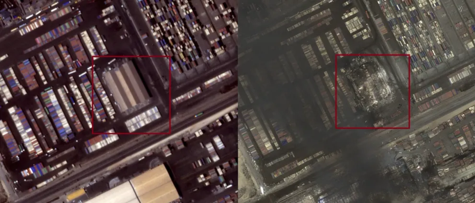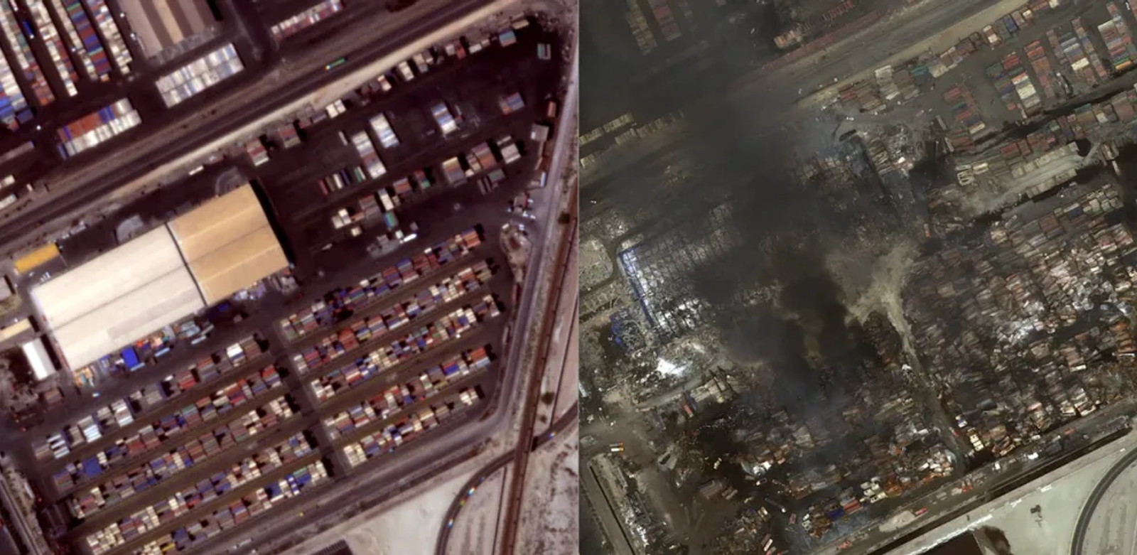 Complete destruction of Sina Company's 15-hectare yard in comparison with a photon taken a month before the explosion