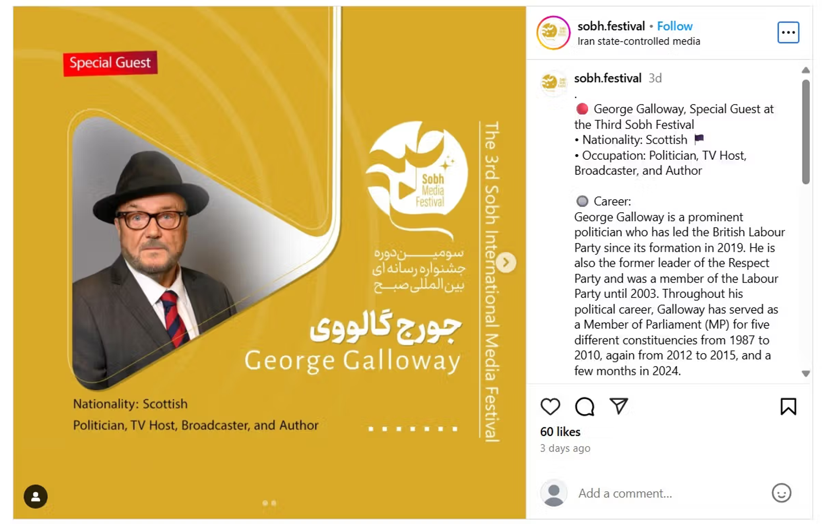 Galloway traveled to Iran to attend the third edition of the Sobh International Media Festival, organized by the foreign media division of Islamic Republic of Iran Broadcasting (IRIB), the country's state media organization.