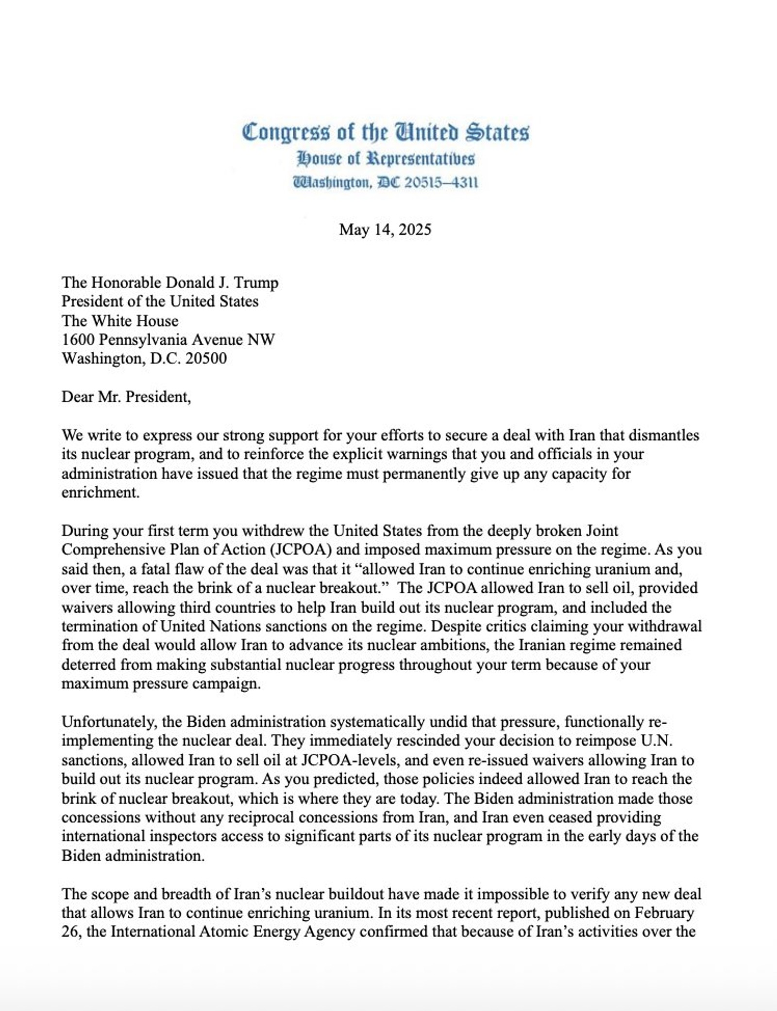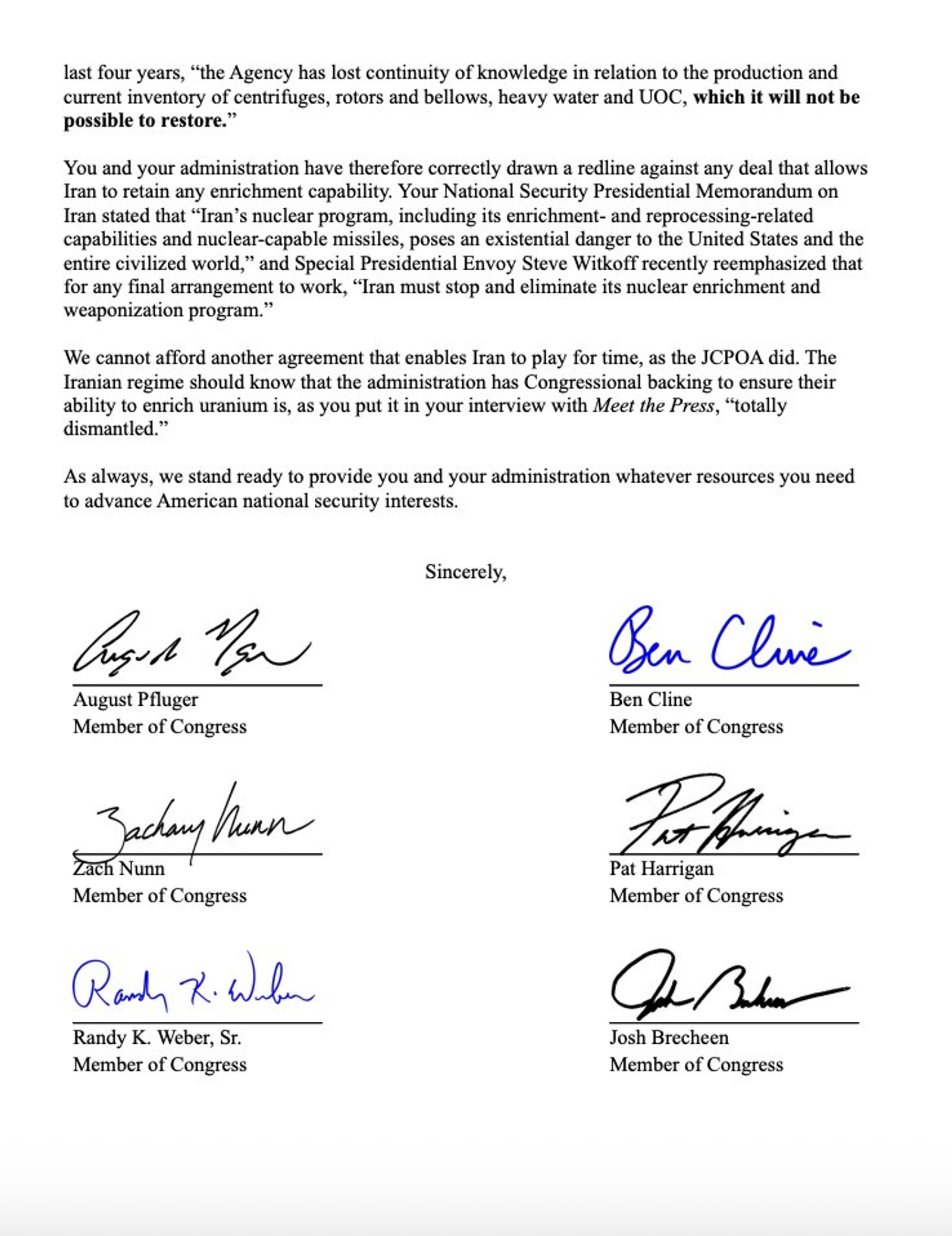 “The United States cannot afford another deal that gives Iran room to maneuver,” the lawmakers wrote. “The regime must be stripped of all enrichment capacity — even for peaceful energy purposes.”