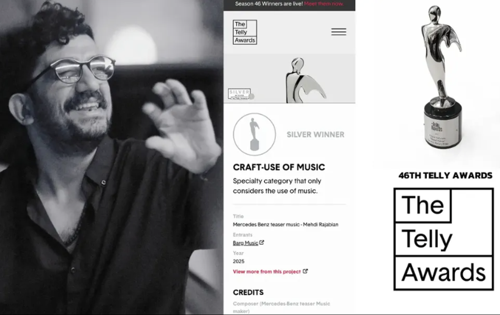 Dissident Iranian composer Mehdi Rajabian has become the first Iranian to win a Telly Award for his work on Mercedes-Benz's promotional teasers, after years of imprisonment for his underground musical activities and outspoken advocacy for artistic freedom.