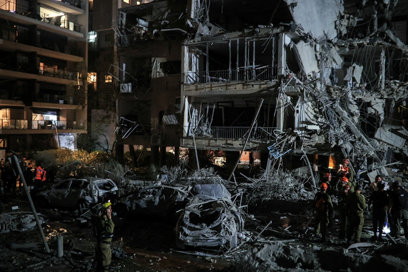 Rescue teams evacuate wounded civilians and search through the rubble in Ramat Gan. According to i24NEWS, at least 63 people were injured, including two critically, and 300 residents were evacuated.