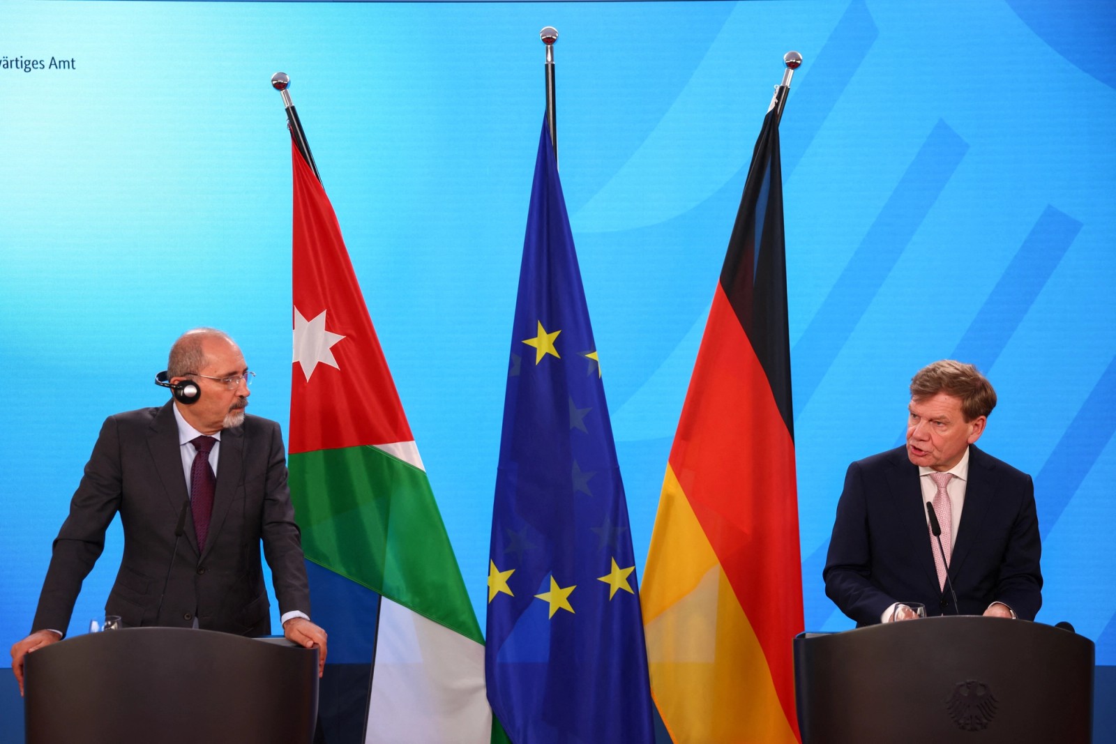 Germany's Foreign Minister Johann Wadephul and Jordan's Foreign Minister Ayman Safadi attend a joint press conference, in Berlin, Germany, June 18, 2025.
