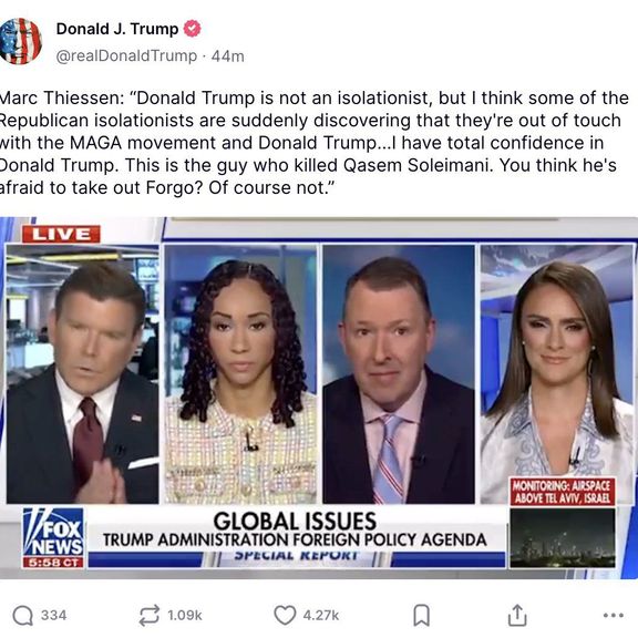 Embedding video from a Fox News interview in which right-wing pundit Marc Thiessen praises Trump, the post incorrectly transliterates his pronunciation, writing: "You think he's afraid to take out Forgo? Of course not.”