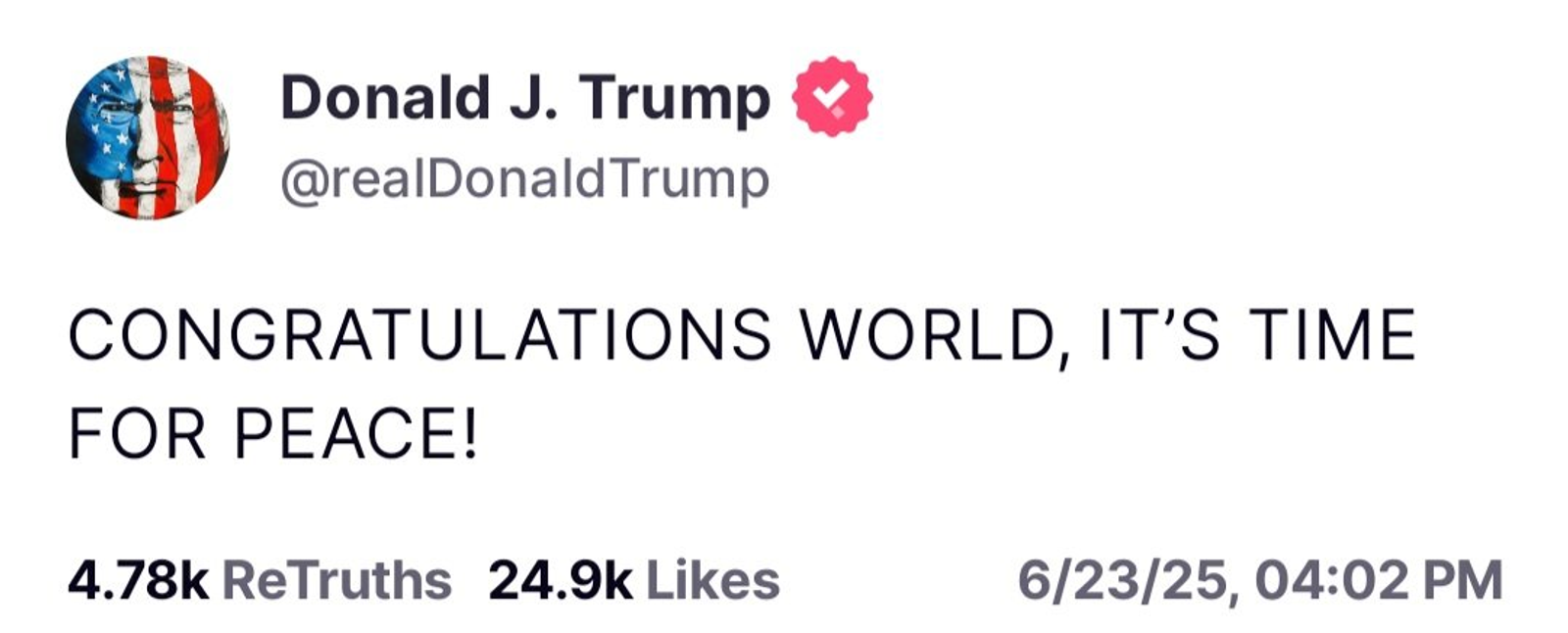 "Congratulations world, it's time for peace," Trump said in another Truth Social post.
