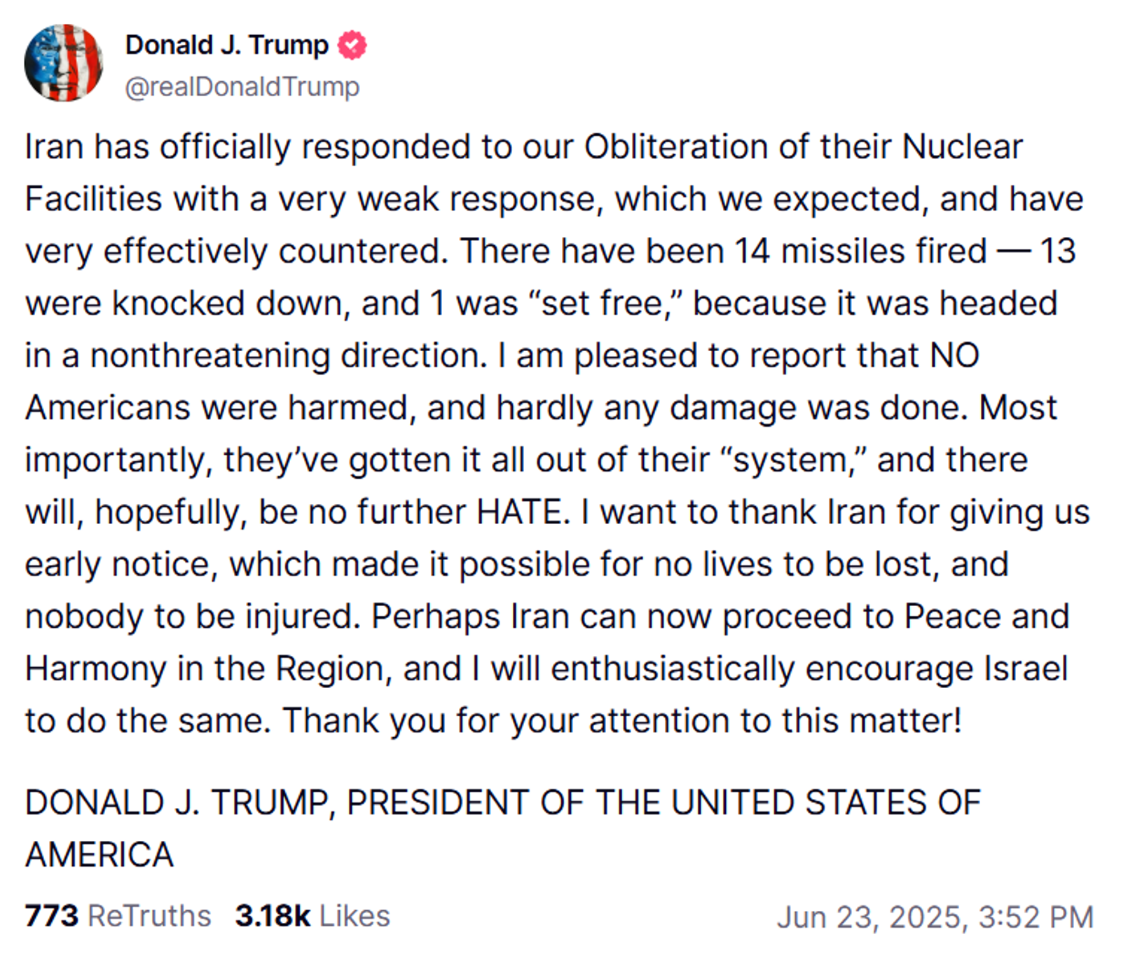 "I want to thank Iran for giving us early notice, which made it possible for no lives to be lost, and nobody to be injured. Perhaps Iran can now proceed to Peace and Harmony in the Region, and I will enthusiastically encourage Israel to do the same!"