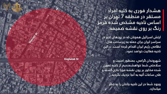 The Israeli military issued a new evacuation warning to the residents of an area in Tehran's District 7, saying it will be operating in this area.