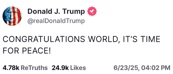 "Congratulations world, it's time for peace," Trump said in another Truth Social post.