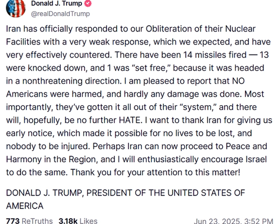 "Iran has officially responded to our Obliteration of their Nuclear Facilities with a very weak response, which we expected, and have very effectively countered," US President Donald Trump said in a post on Truth Social.