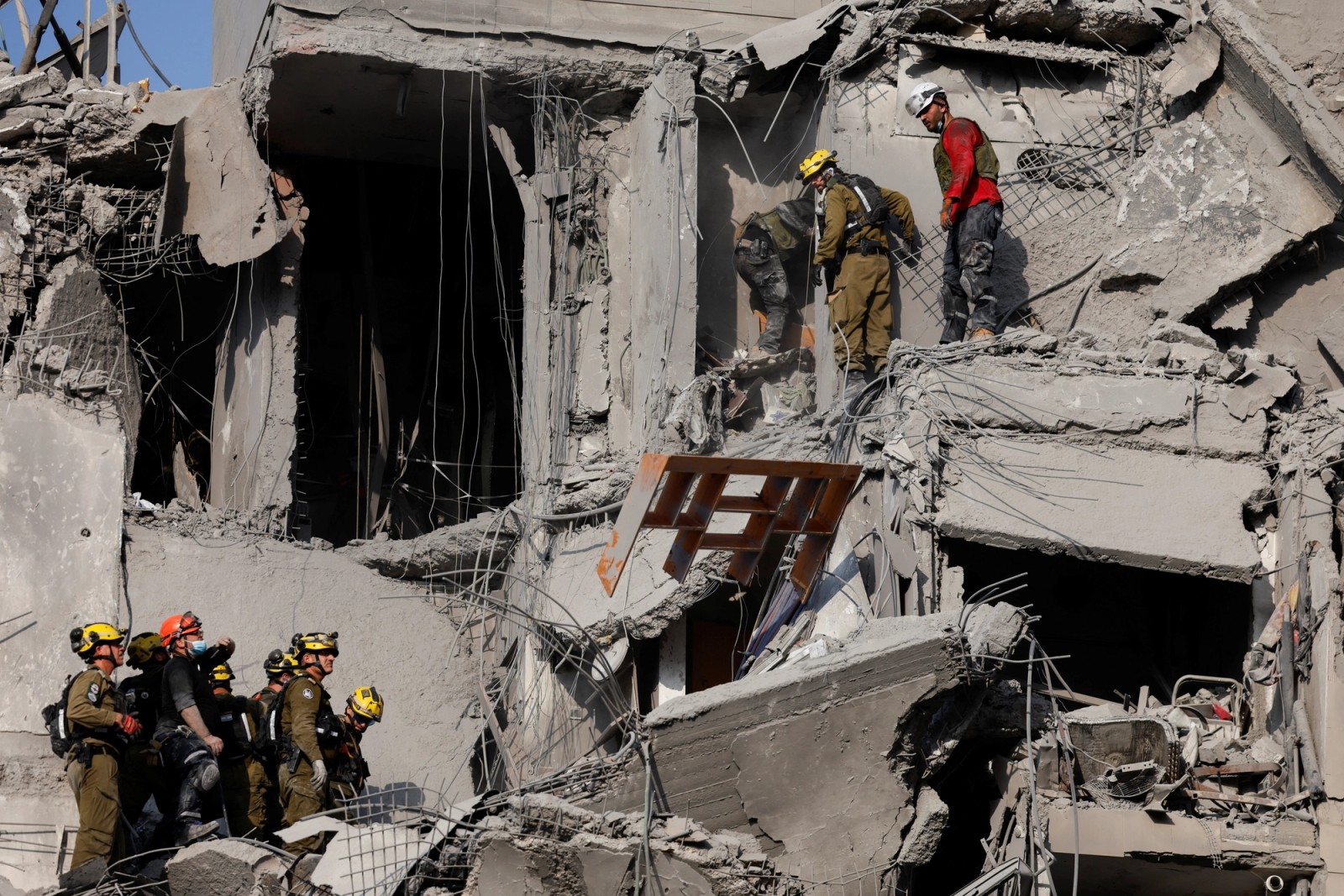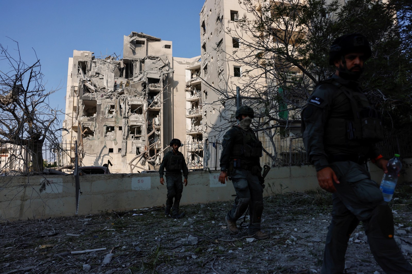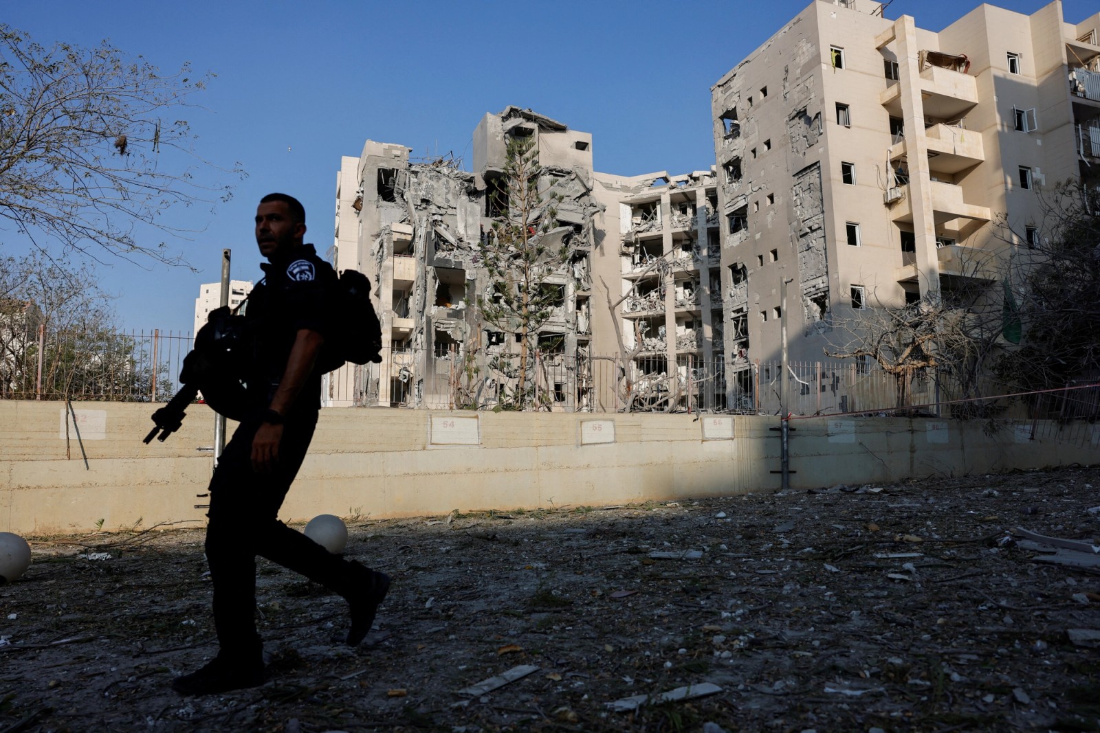 Damaged buildings are seen in Be'er Sheva, southern Israel, following missile attacks from Iran on Israel, as security forces walk past the site on June 24, 2025.