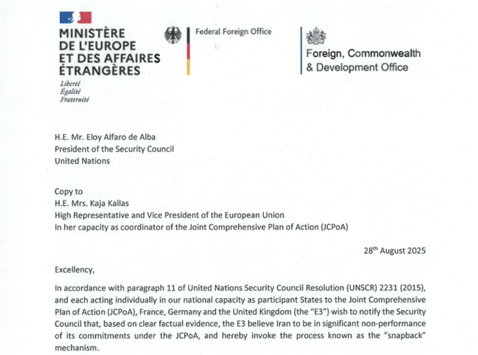 E3 cite their 'good faith efforts', Iranian non-compliance in UN letter
