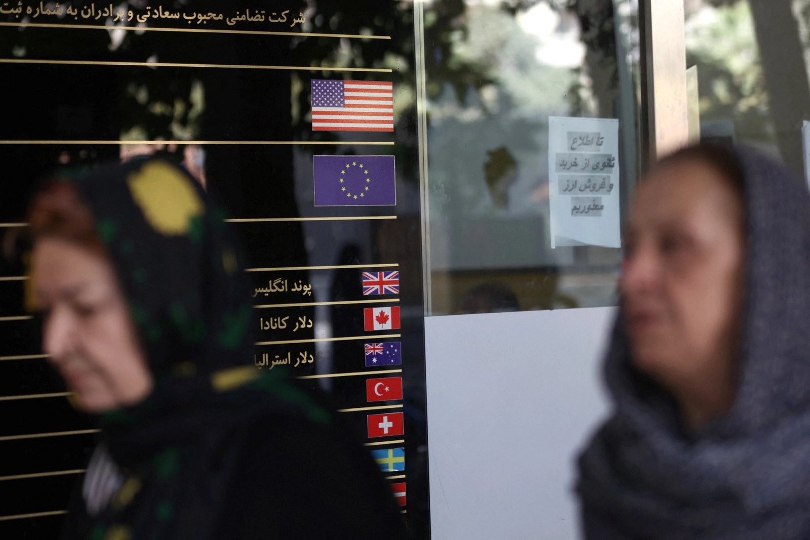 The American flag and other flags are displayed on a sign at a currency exchange in Tehran, Iran, September 27, 2025.