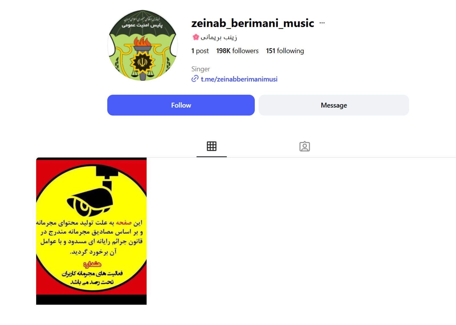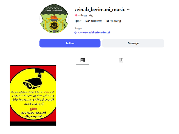 The accounts of Mandana Akbarzadeh, Azadeh Kebriya, Zeinab Berimani, and Fatereh Hamidi have been taken offline, displaying a message that reads: “This page has been blocked due to the production of criminal content."