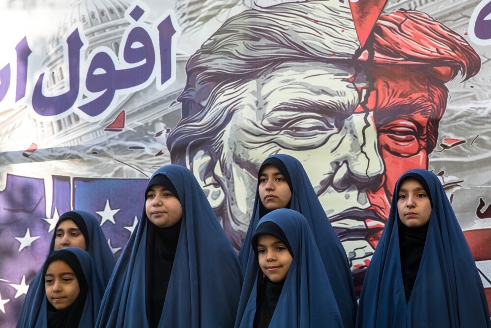 Students in black chadors pose in front of a mural of US president Donald Trump on the sidelines of a state-sponsored rally to mark the seizure of the US embassy in Tehran after the 1979 Revolution, November 5, 2025