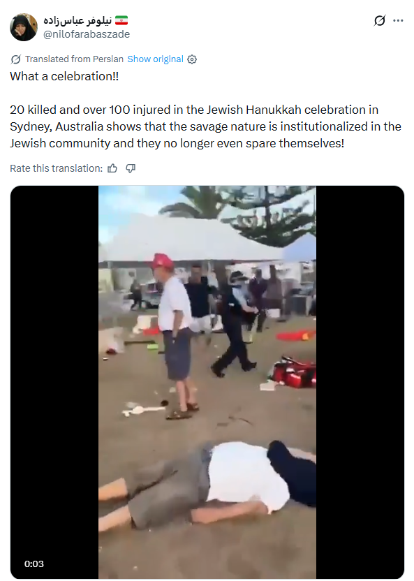 Fellow IRGC outlet Fars News described the incident as a “murky story,” questioning the plausibility of a lone or independent attack. The outlet wrote: “It's not normal for individuals to open fire on hundreds of people at a public celebration,” framing the shooting as a product of “widespread anti-Zionist sentiments” and invoking the October 7 attack on Israel.