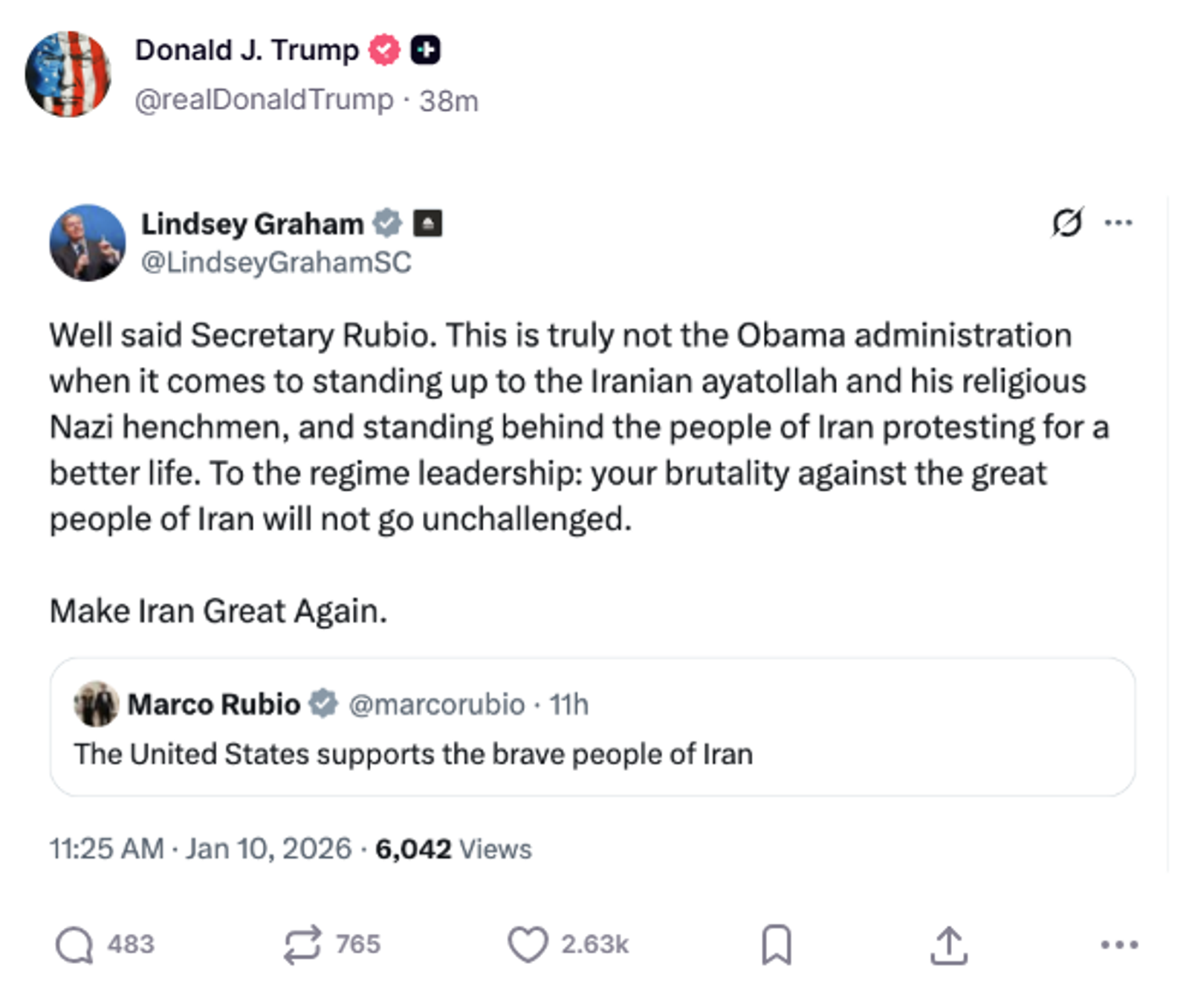 Earlier in the day, Trump had once again voiced support for protests in Iran, reposting on Truth Social a post by Republican Sen. Lindsey Graham who praised State Secretary Marco Rubio’s backing of protesters and used the slogan “Make Iran Great Again.”