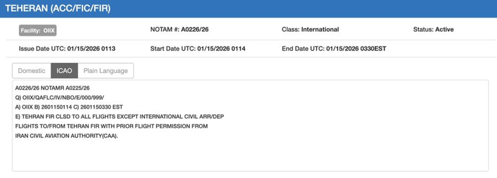 The NOTAM (Note to Airmen) shows the airspace will remain closed until 03:30 (UTC).