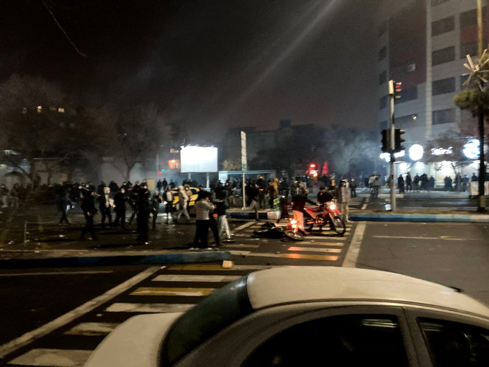 Protesters gather on Afifabad Street in Shiraz on January 8, 2025 as flames rise in the background during overnight unrest.