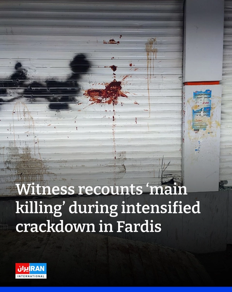 A witness to protests in Fardis, Alborz province, said the “main killing” occurred on Friday, January 9, when security forces intensified their crackdown and opened fire with live ammunition on protesters after initially allowing the gathering to proceed.