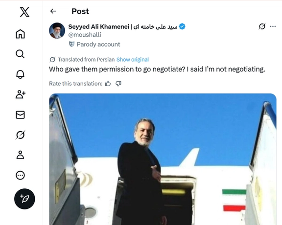 One parody account using Larijani’s name published a post arguing that anyone who believes a meaningful agreement can be reached with the Islamic Republic is naïve.