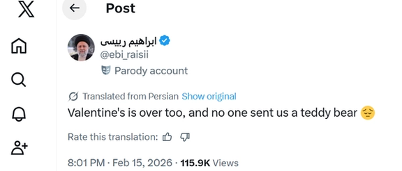 A parody account impersonating former president Ebrahim Raisi posted a Valentine’s Day message lamenting that “no one sent us a teddy bear,” while another billed itself as “the first president in Iran’s history to be eaten by a bear” – a darkly comic nod to the online satire that has persisted around his death.