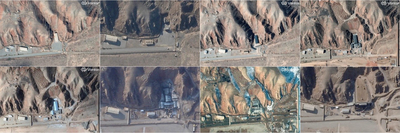 Near the Natanz enrichment site, satellite imagery shows ongoing efforts to strengthen tunnel entrances under a nearby mountain, with heavy equipment and construction activity visible.