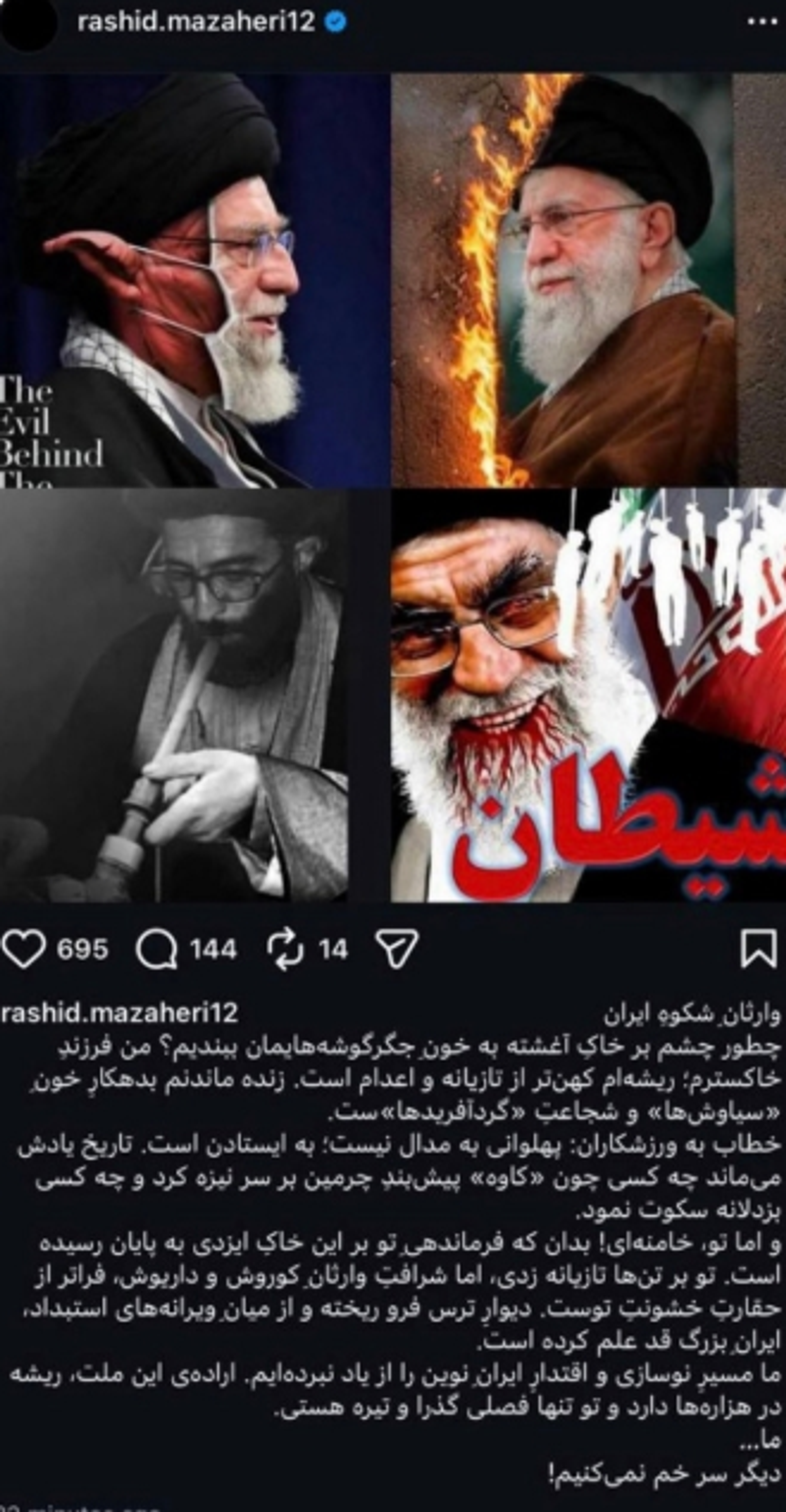 Mazaheri on Wednesday posted an image on Instagram of Khamenei labeled “Satan,” with the caption: “Your command over this sacred land has ended.”
