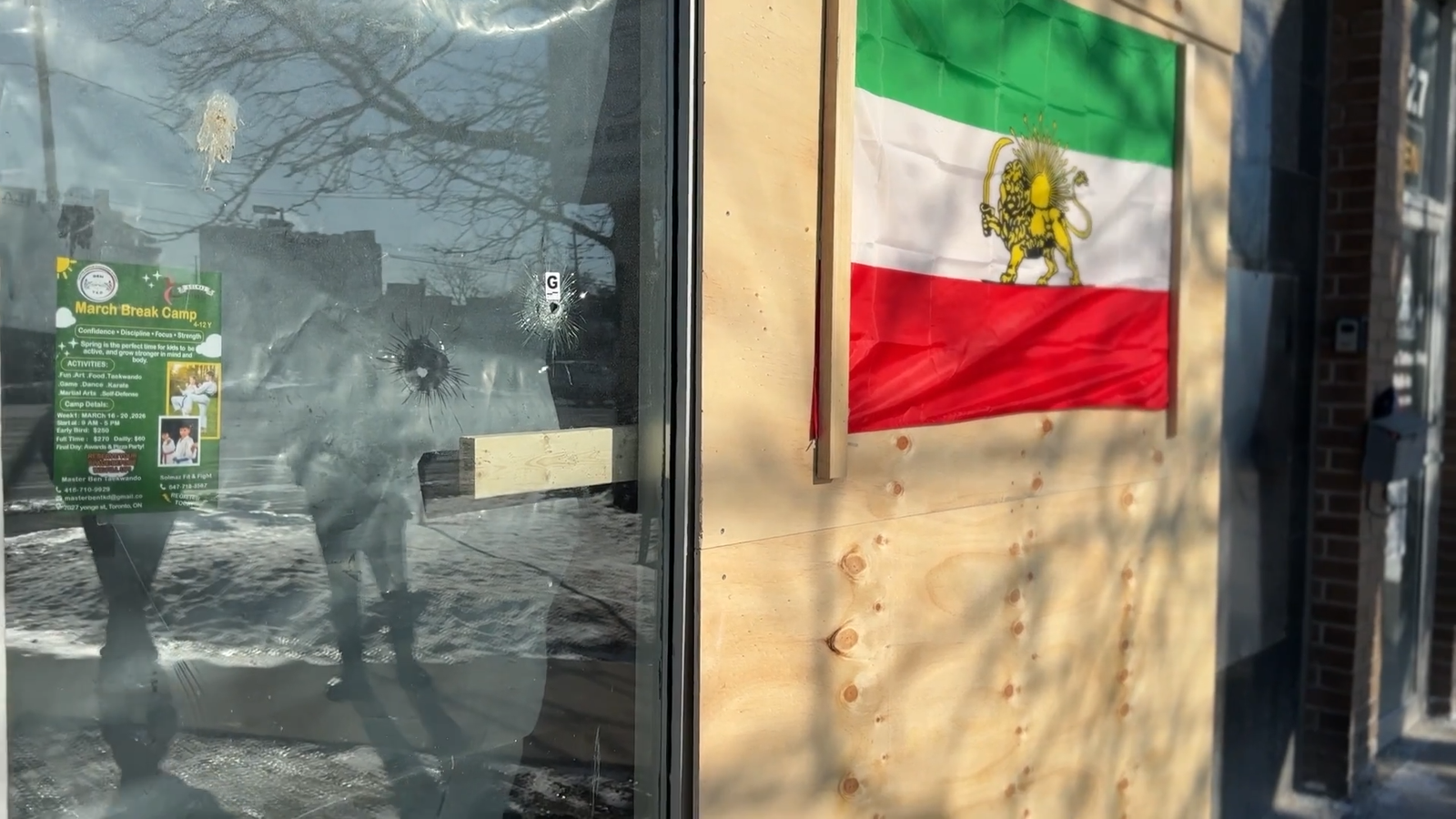 Video shared by Gholami showed multiple bullet holes across the front windows of Saliwan Boxing Club on Yonge Street, some displaying pro-Iranian liberation flags and images. At least two panes were shattered, and an evidence marker was visible above one of the bullet holes.