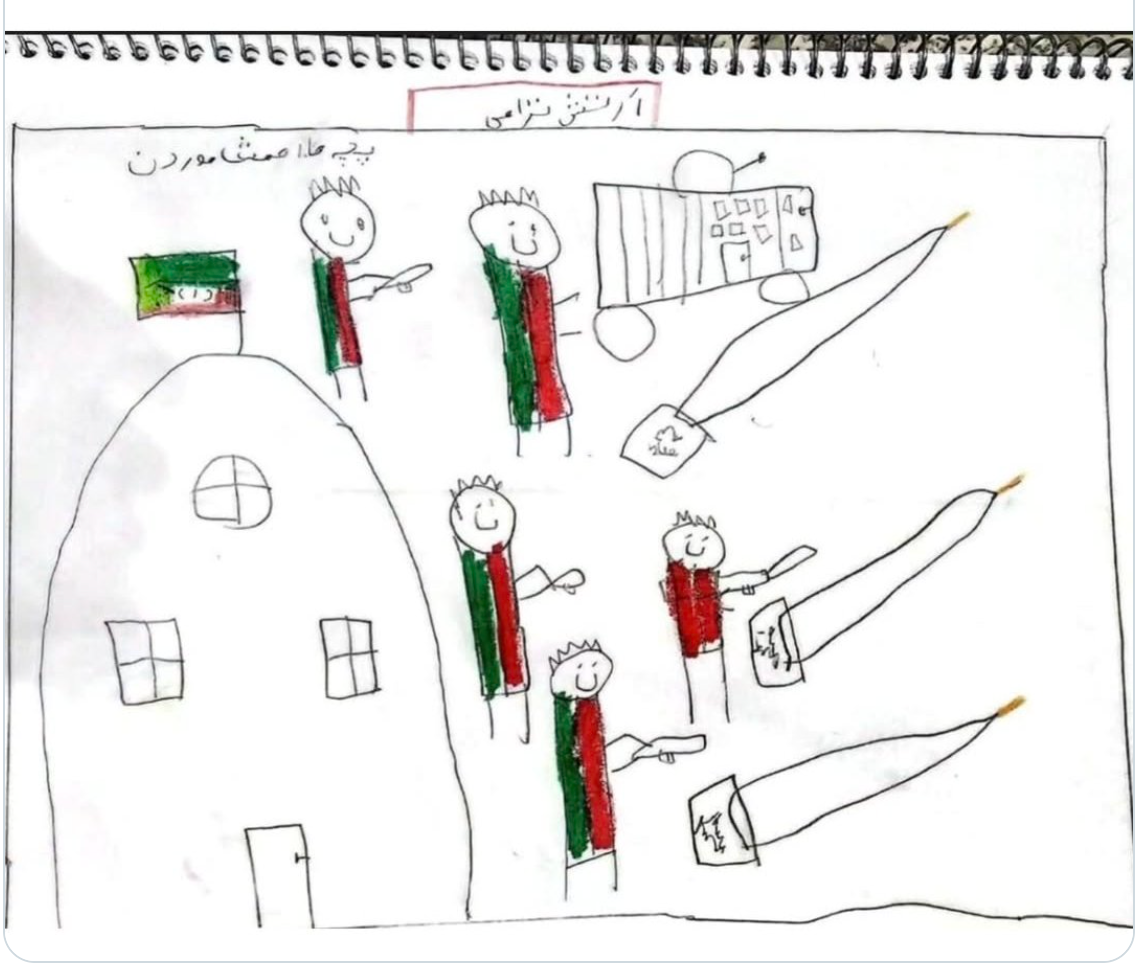 Found later in his backpack, it shows a school building with the Iranian flag above it, five children standing in the yard and three missiles descending toward them.