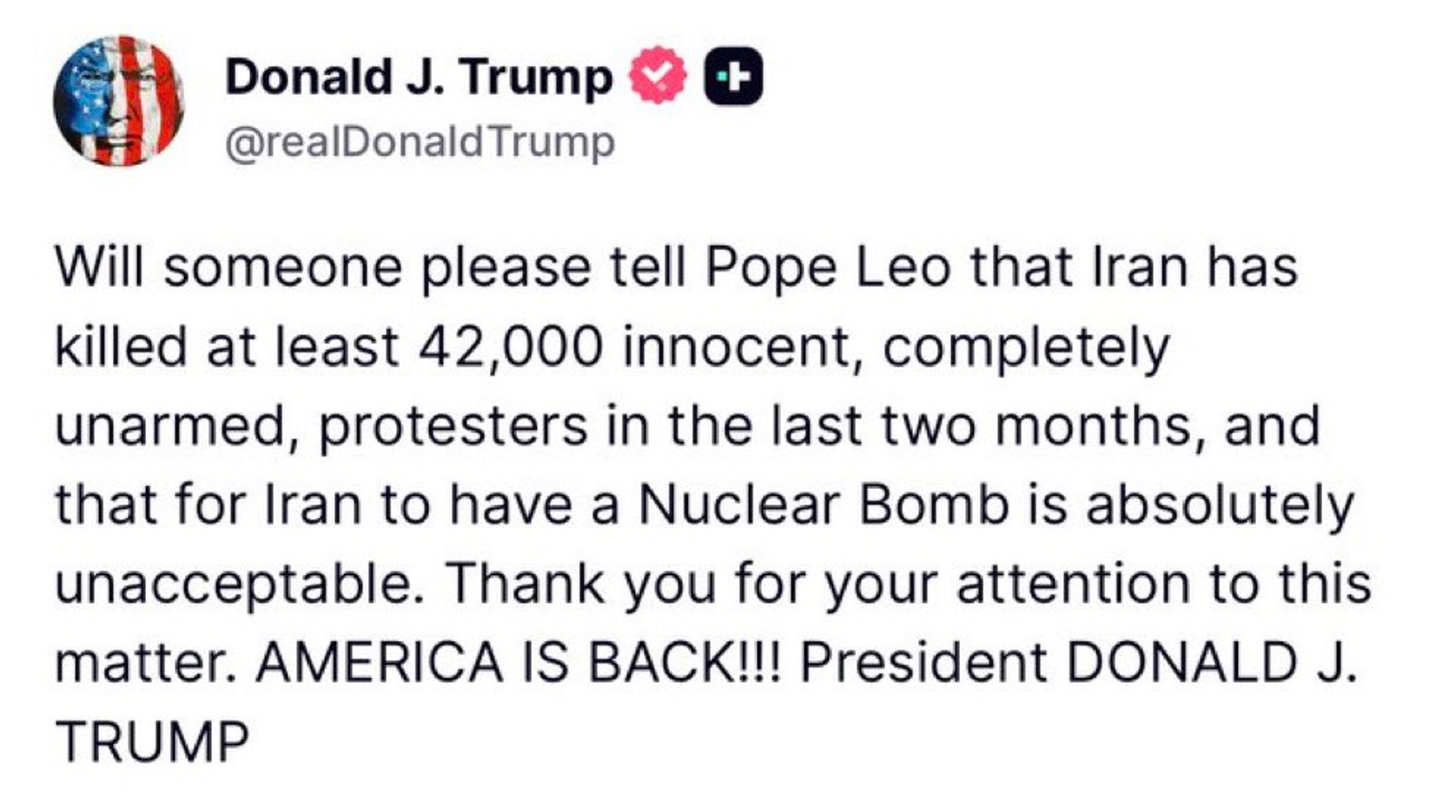 “Will someone please tell Pope Leo that Iran has killed at least 42,000 innocent, completely unarmed, protesters in the last two months, and that for Iran to have a Nuclear Bomb is absolutely unacceptable,” Trump wrote.