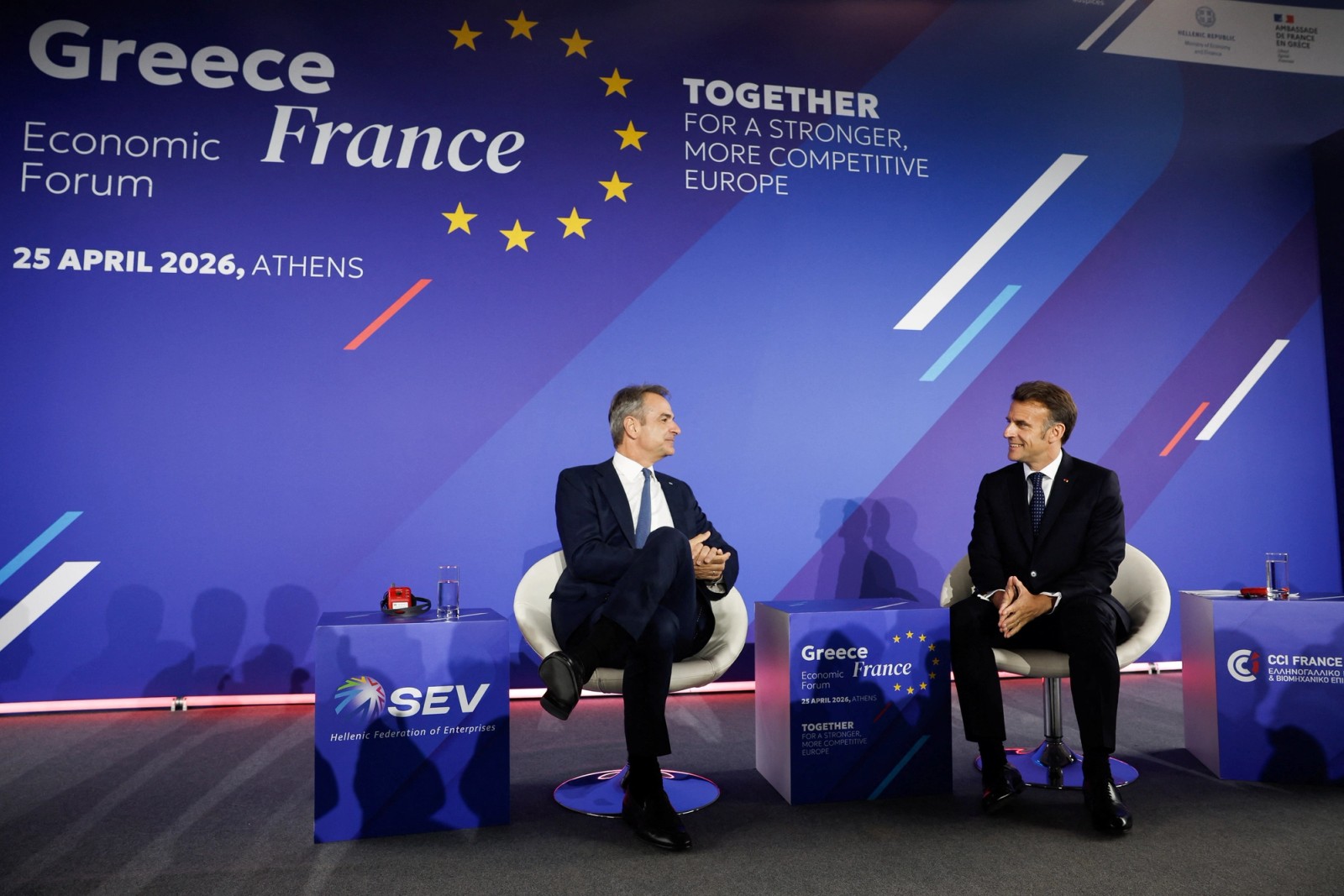 French President Emmanuel Macron and Greek Prime Minister Kyriakos Mitsotakis attend a Greece–France Economic Forum at the Stavros Niarchos Foundation Cultural Center in Athens, Greece, April 25, 2026.