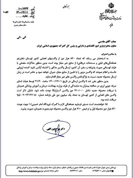 در این نامه همچنین نوشته شده: «واکسن ارسالی توسط هیات امنای صرفه جویی ارزی در معالجه بیماران به نمایندگی از طرف وزارت بهداشت، درمان و آموزش پزشکی همزمان با دریافت محموله جدید شامل ۷۱۰ هزار دوز واکسن آسترازنکا عودت داده شود.»